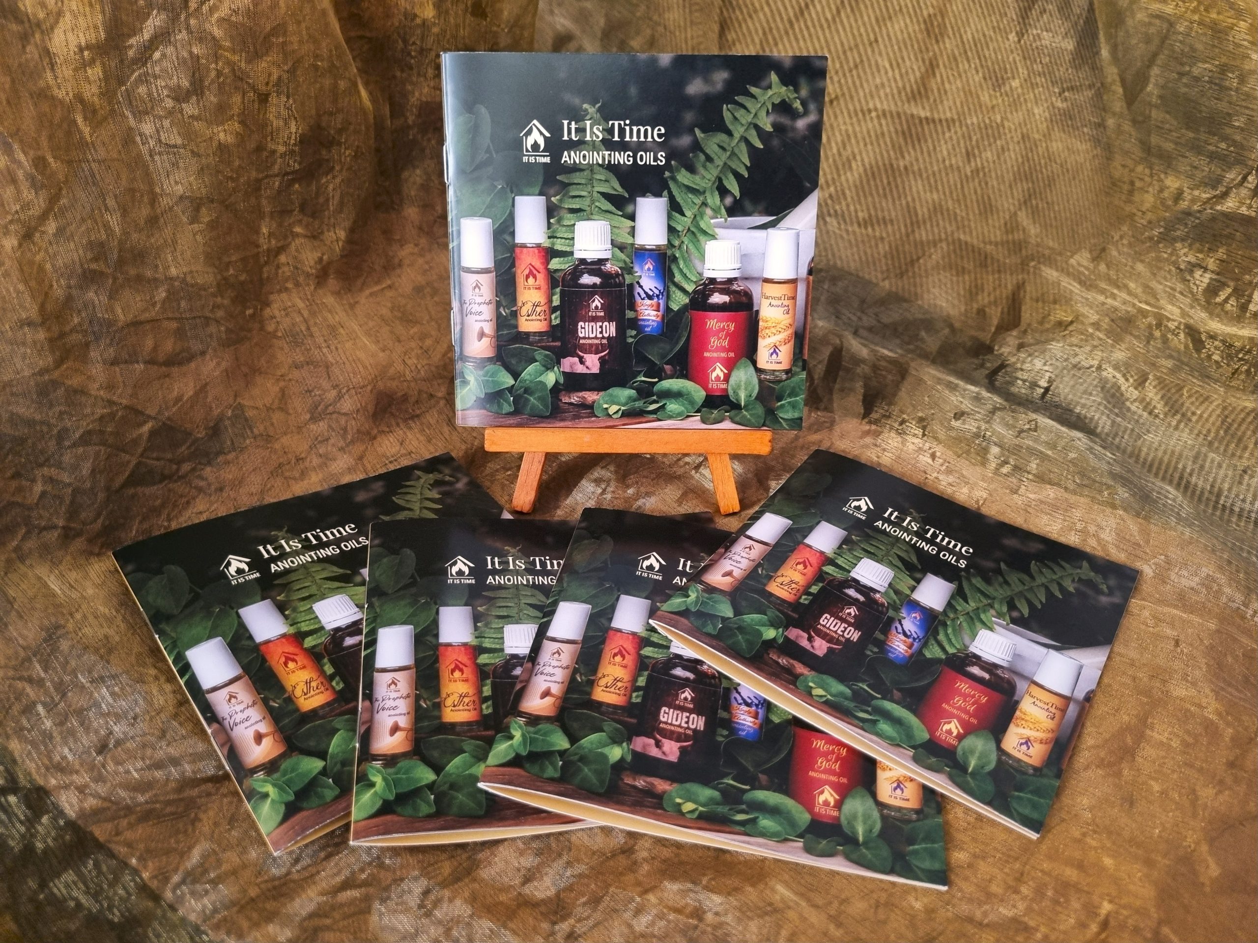 This booklet describes each of the fourteen IT IS TIME Anointing Oils, detailing the inspiration behind each formulation, as well as its prophetic meaning and application. The booklet also contains a ‘How to Use Anointing Oil’ section, based on how anointing oil was used in the Bible, and what it means to be anointed. The back page provides a concise overview of all fourteen oils—their names and meanings—for you as a quick reference.